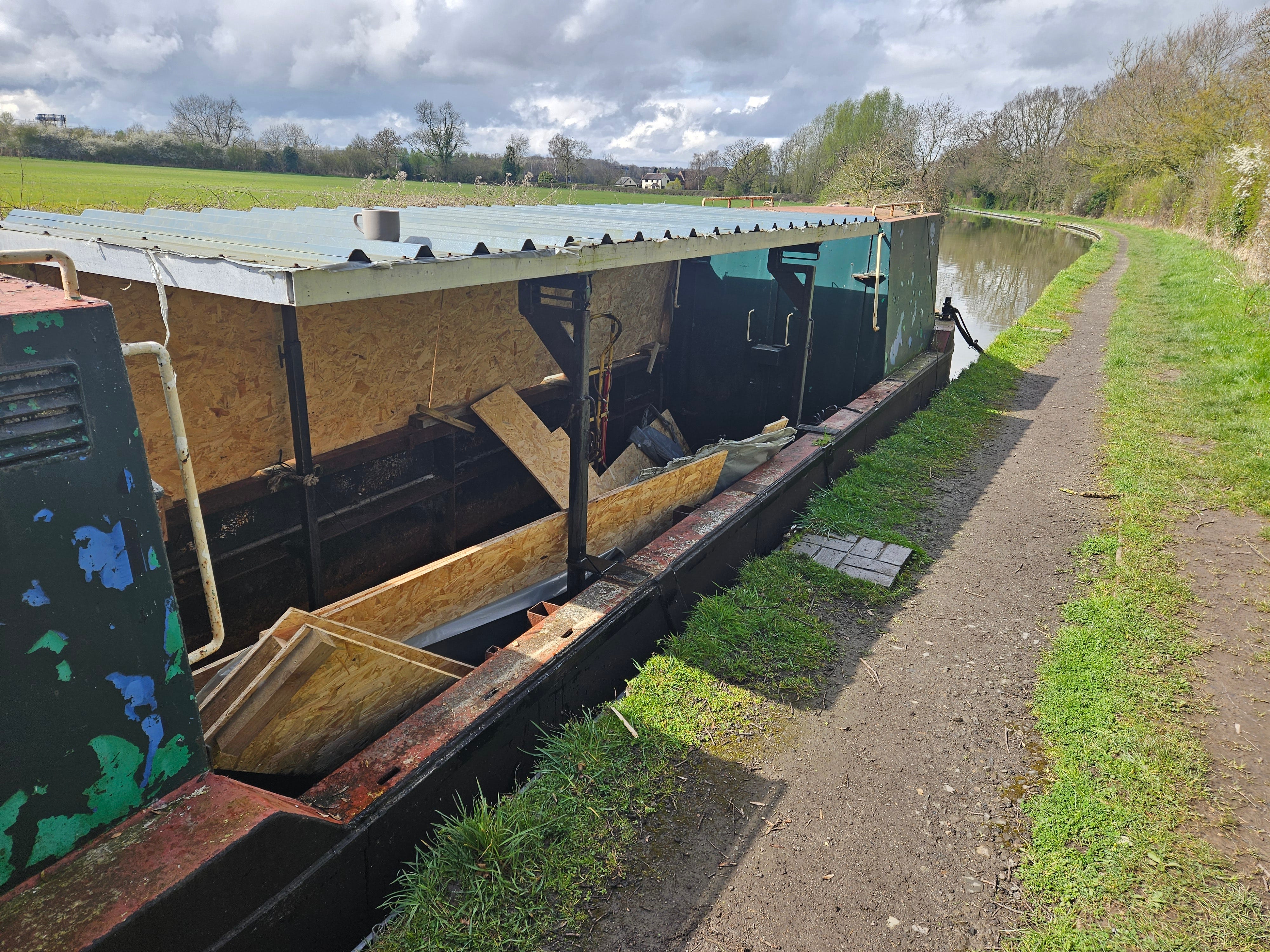 The Fazeley run-through on Sunday was marked by two significant events; the first being the removal of the winter boat covering. After months of being hunkered down against the constant wind and rain (another record-breaking winter for rainfall in England), the need to open the central cabin has become pressing. In order to measure up and enable the building of the workshop, all the existing centre structure must be removed, including the middle sides and roof, handrails and external handles of the fore and aft cabins. The temporary timber sides coming off is the first step, and for the first time in six months it is possible to cruise in the hold and see the world from a duck’s-eye view.