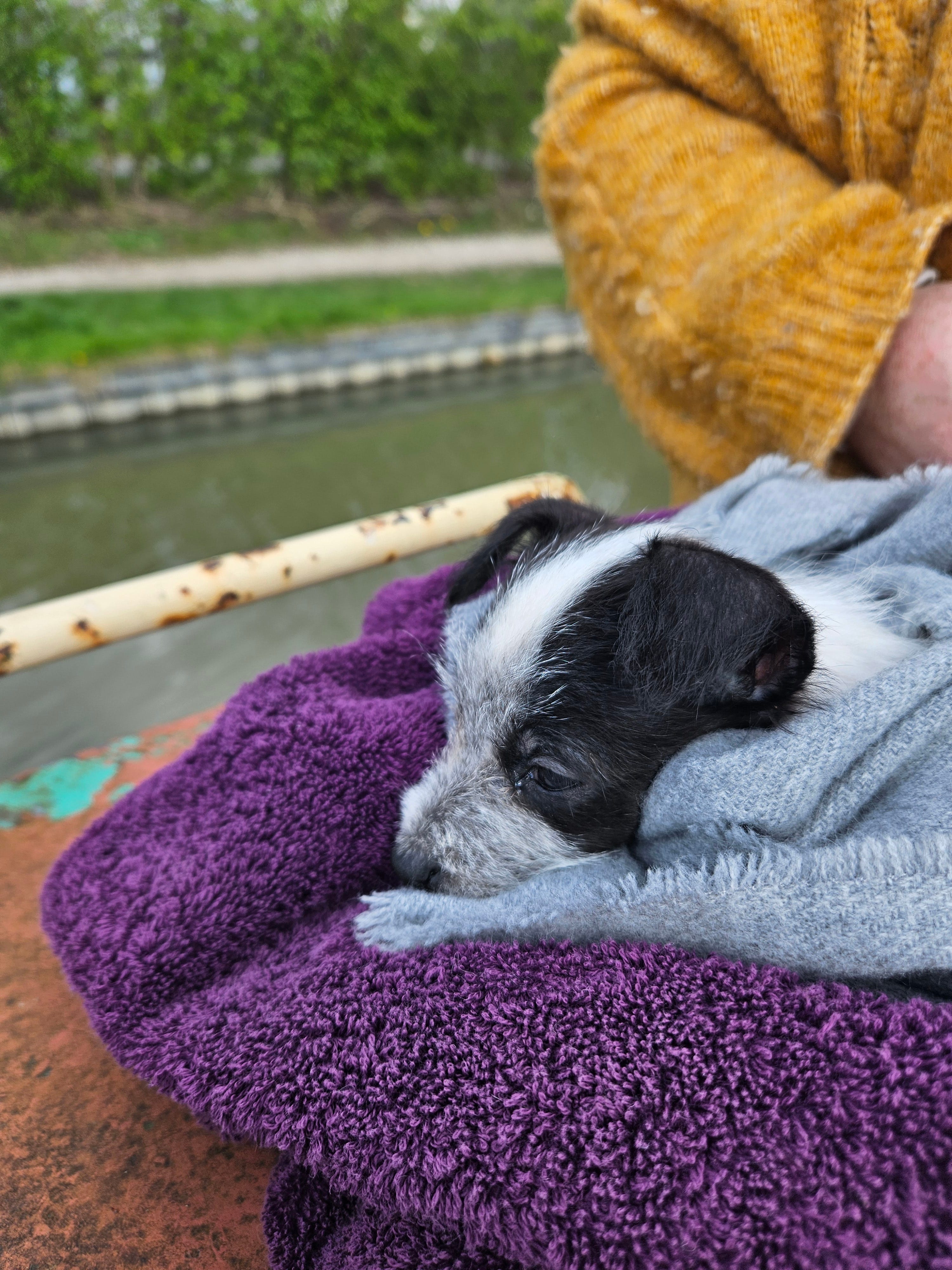 The second, and far more monentous event of the day is the addition of a new boat’s apprentice. At a little over ten weeks old Dora the terrier joined Willow for her first day on the water. Though she is yet no bigger than an outstretched hand, she took to the day with aplomb. A quick inspection of the craft for travel-worthiness, a bowl of milk for Dutch courage, and she spent the rest of the day on the roof wrapped in towel and scarf, happily watching the world drift by.